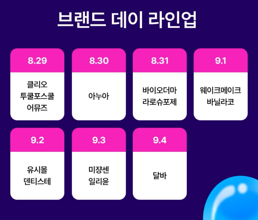- 9/1 (월): 웨이크메이크 & 바닐라코: 색조 카테고리에서 웨이크메이크의 공세가 예상됩니다. 바닐라코는 '클린 잇 제로'를 중심으로 클렌징 카테고리 1위를 노릴 것입니다.