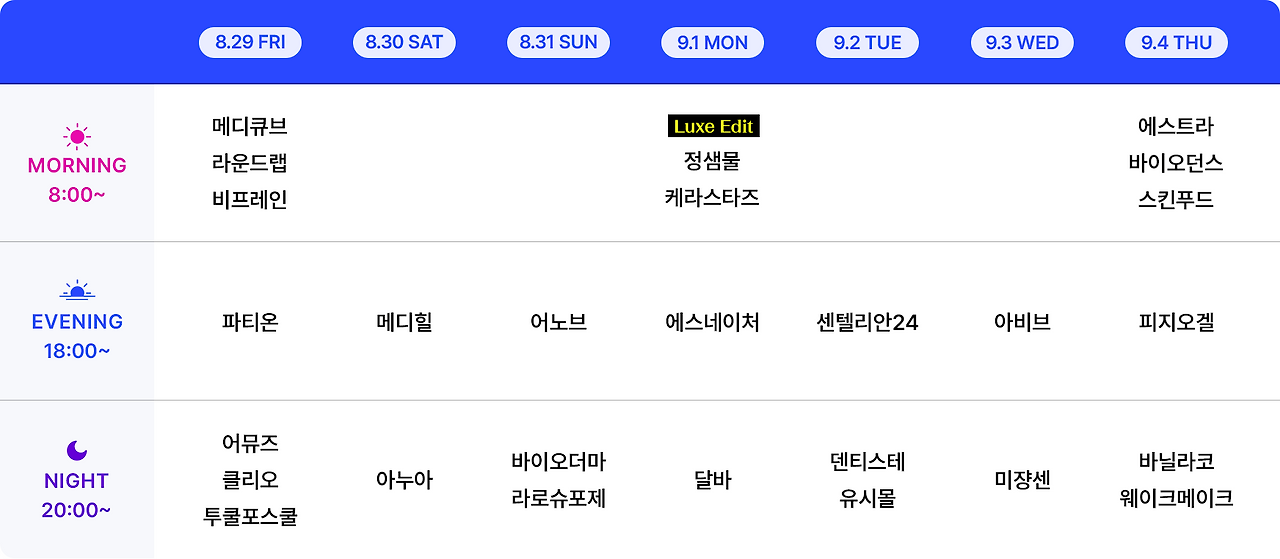 세일 기간에 특별 프로모션 없이 상위를 유지하기는 어렵습니다. 메디힐은 다(多)SKU·볼륨 기획과 강한 할인 설계를 병행해 브랜드 랭킹 1위를 공고히 했고, 클리오·달바·라로슈포제는 지정일 집중 화력으로 브랜드 전체 인지도를 효과적으로 끌어올렸습니다.